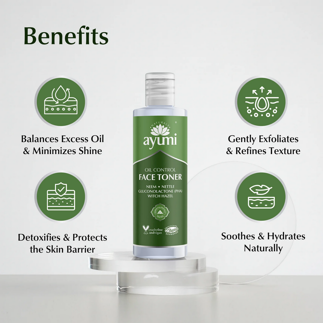 Gluconolacton (PHA), glycerine, biologische aloë vera, neem, tea tree, toverhazelaar, brandnetel
